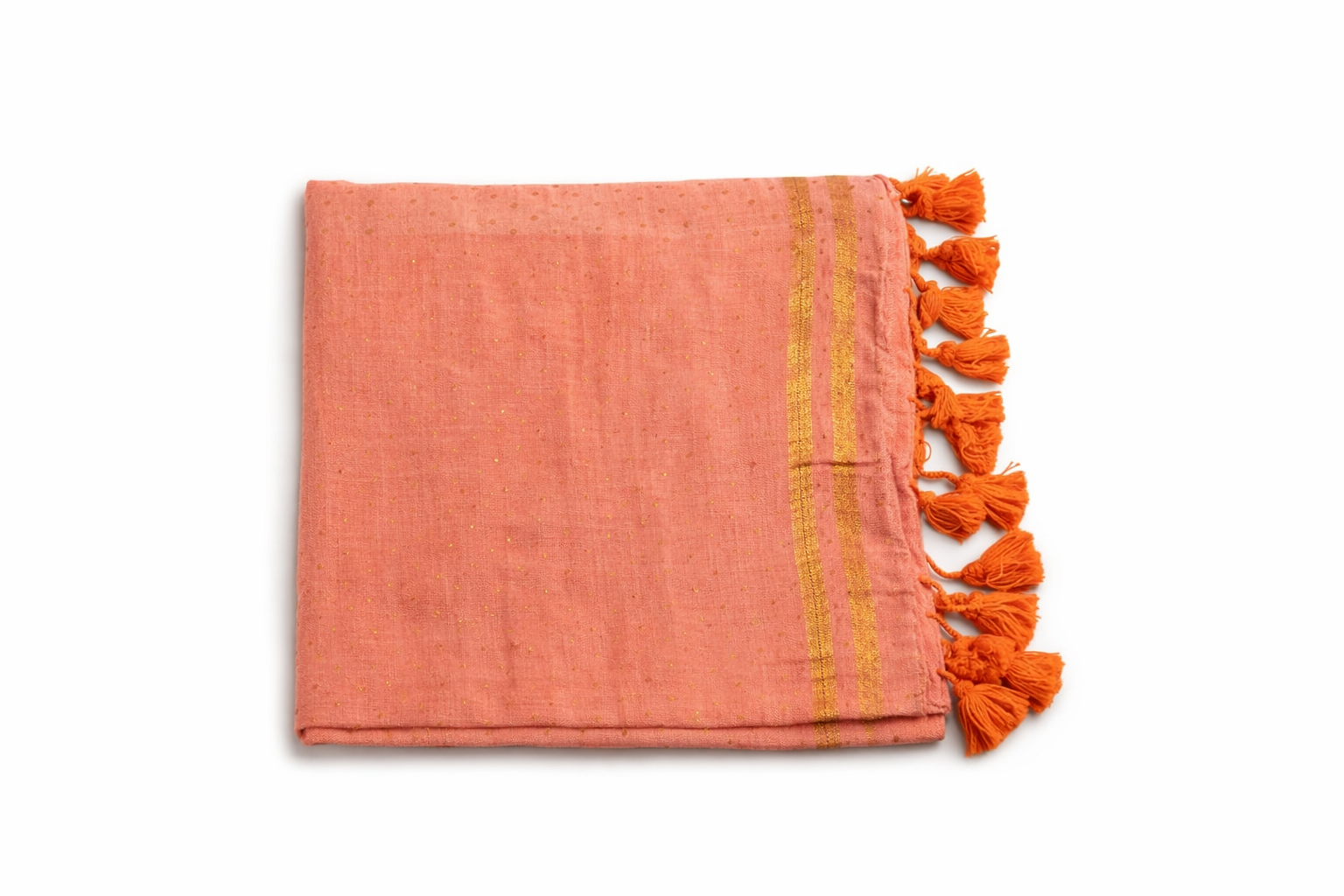 Radiate warmth in this Peach-Orange Mul Cotton Saree, beautifully accented with a shimmering gold zari border and delicate gold butti highlights. Crafted from ultra-soft, breathable mul cotton, it provides a lightweight drape that ensures comfort from dawn until dusk. The pallu is adorned with vibrant matching tassels, adding a playful yet sophisticated touch to the traditional silhouette. Perfect for festive celebrations or elegant daytime affairs, this saree is a timeless addition to any ethnic wardrobe.